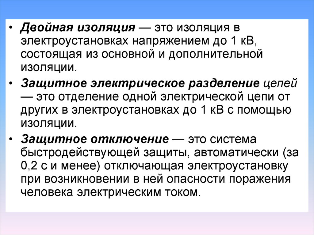 • Двойная изоляция — это изоляция вэлектроустановках напряжением до 1 кВ,