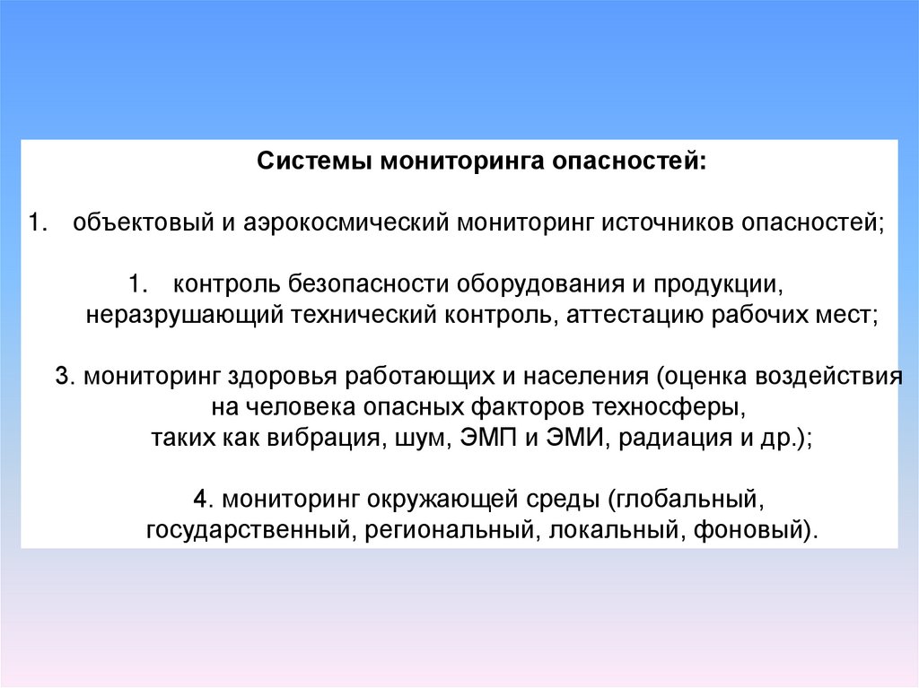 Системы мониторинга опасностей:1. объектовый и аэрокосмический мониторинг источников опасностей;
