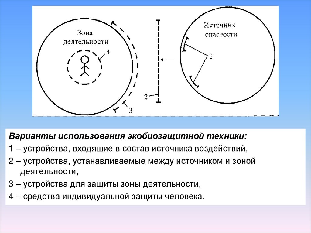 Варианты использования экобиозащитной техники:1 – устройства, входящие в состав источника воздействий,