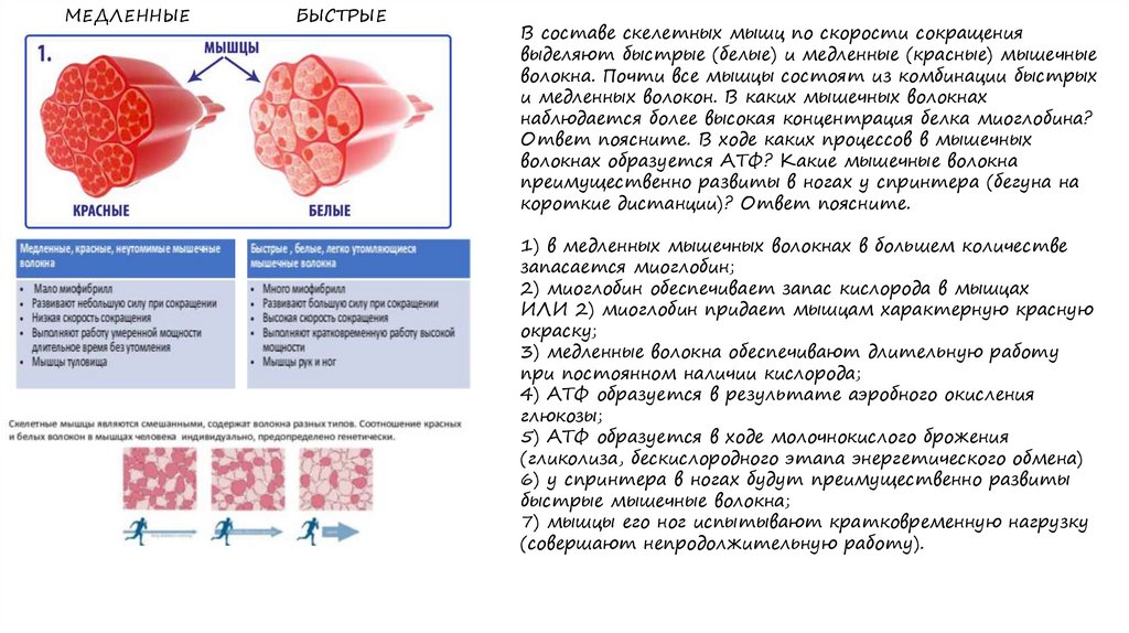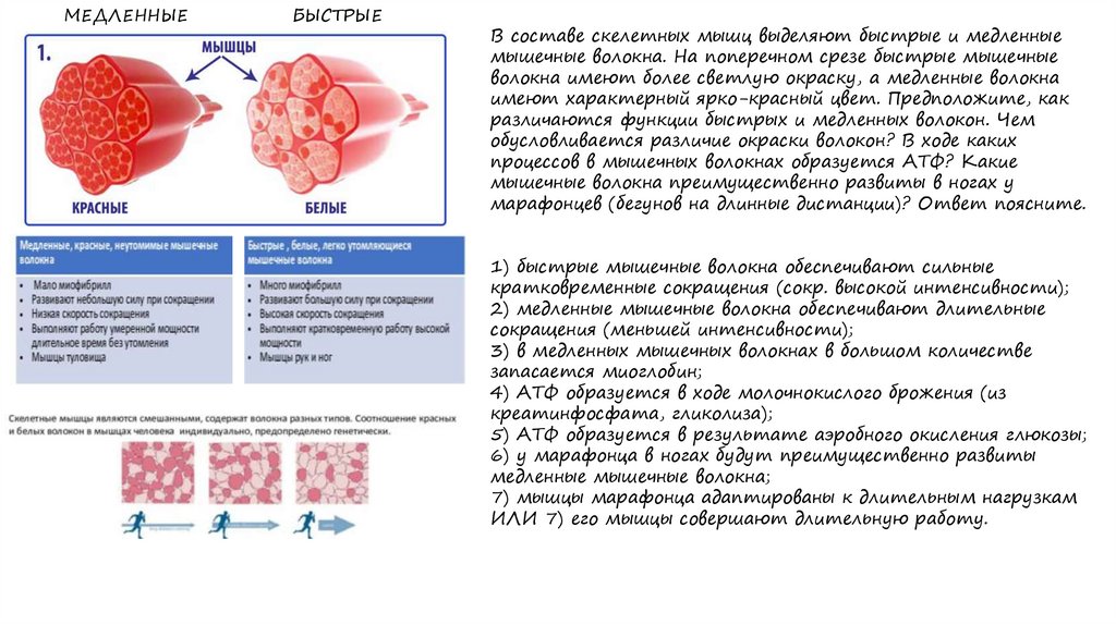 выделяют быстрые (белые) и медленные (красные) мышечные