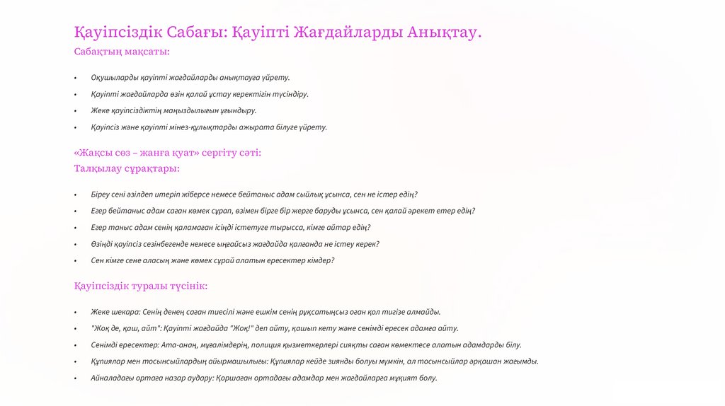 Қауіпсіздік Сабағы: Қауіпті Жағдайларды Анықтау.Сабақтың мақсаты: