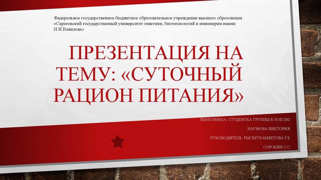 1. Презентация на тему: «Суточный рацион питания»