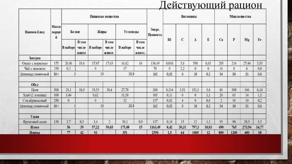 5. При составление моего действующего рациона было большое количество нехватки витаминов, минеральных веществ, а так же жиров и