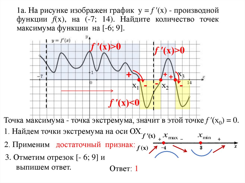 1а. На рисунке изображен график у = f ′(x) - производнойфункции f(x), на (-7; 14). Найдите количество точек