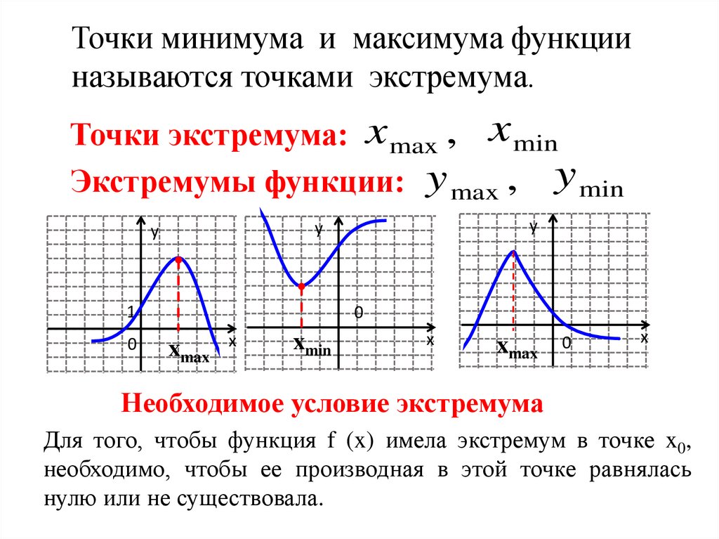 Теорема. Для того, чтобы функция f (x) имела экстремумв точке x0, необходимо, чтобы ее производная в этой