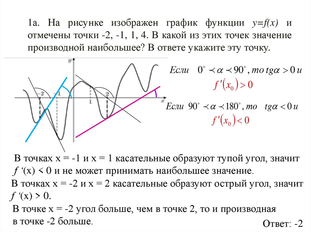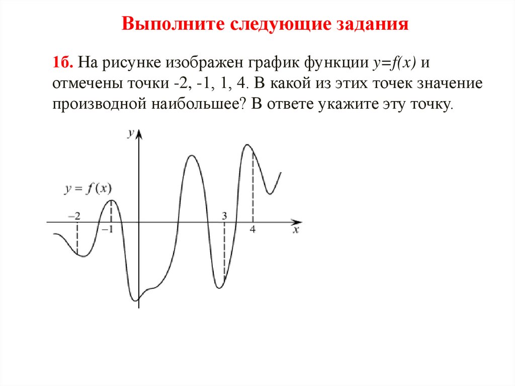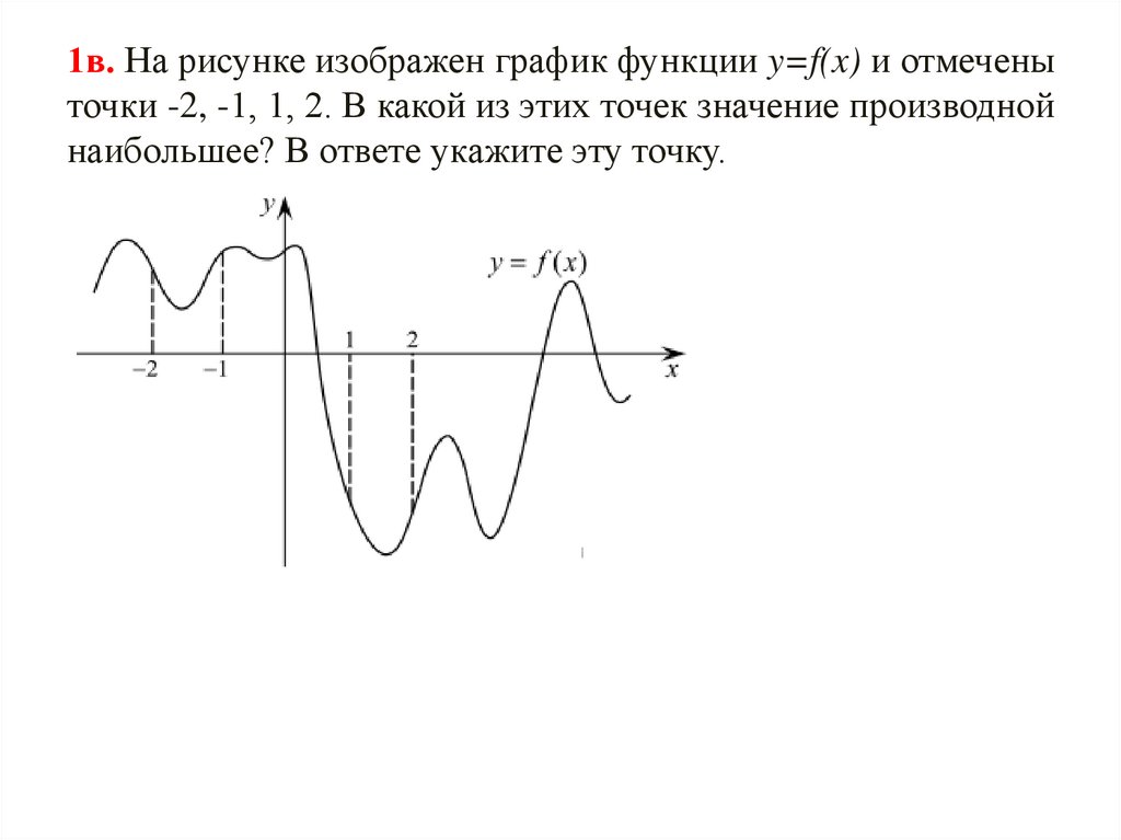 1в. На рисунке изображен график функции y=f(x) и отмеченыточки -2, -1, 1, 2. В какой из этих точек значение производной