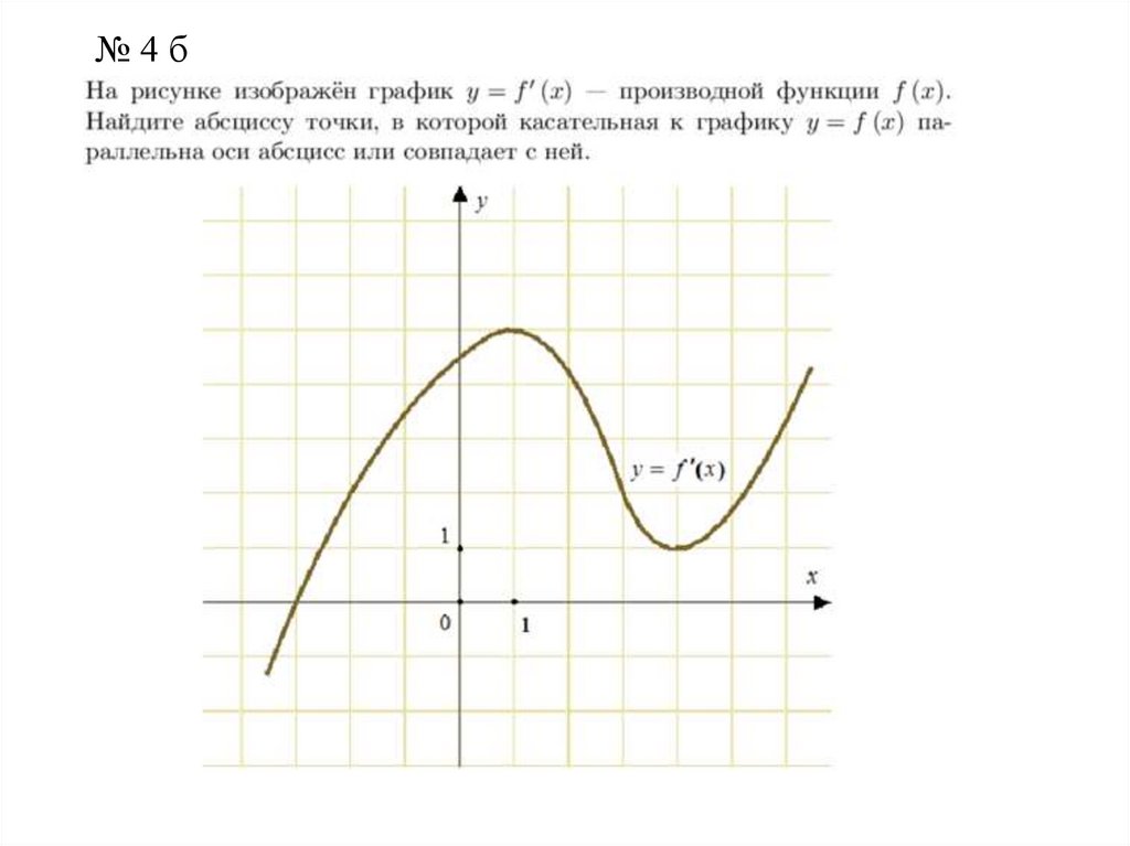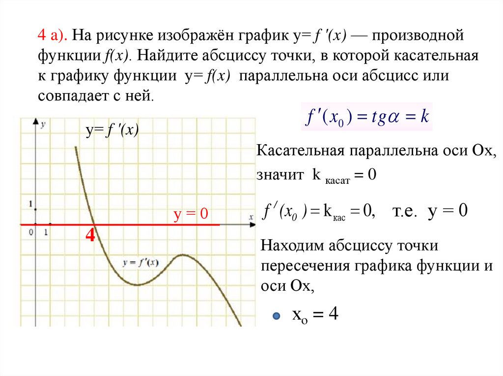 4 a). На рисунке изображён график у= f '(x) — производнойфункции f(x). Найдите абсциссу точки, в которой касательная