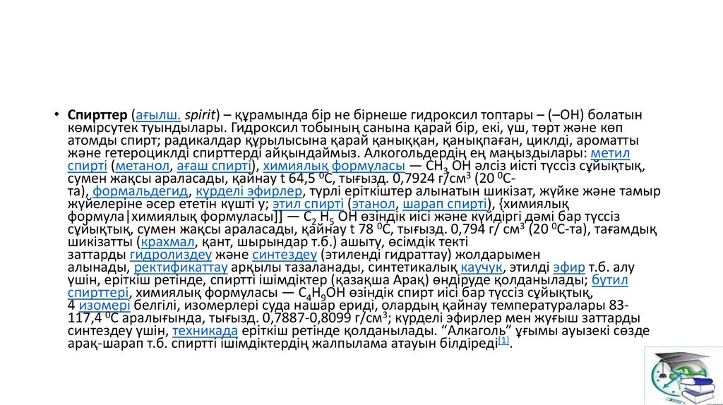 • Спирттер (ағылш. spіrіt) – құрамында бір не бірнеше гидроксил топтары – (–ОН) болатынкөмірсутек туындылары. Гидроксил тобының санына қарай бір, екі, үш, төрт және көп