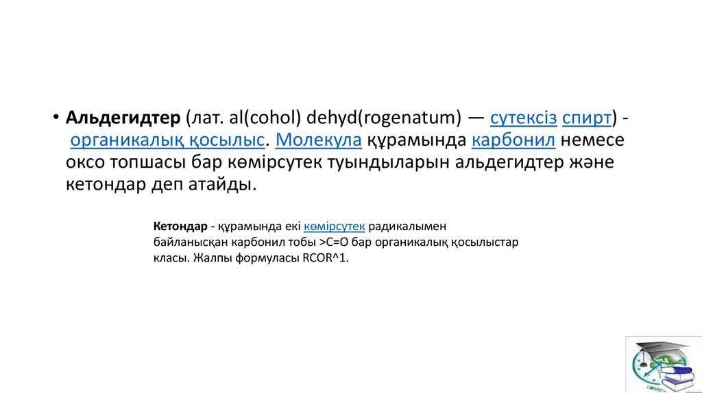 • Оларға: спирттер, альдегидтер, кетондар, оксимдер, органикалық