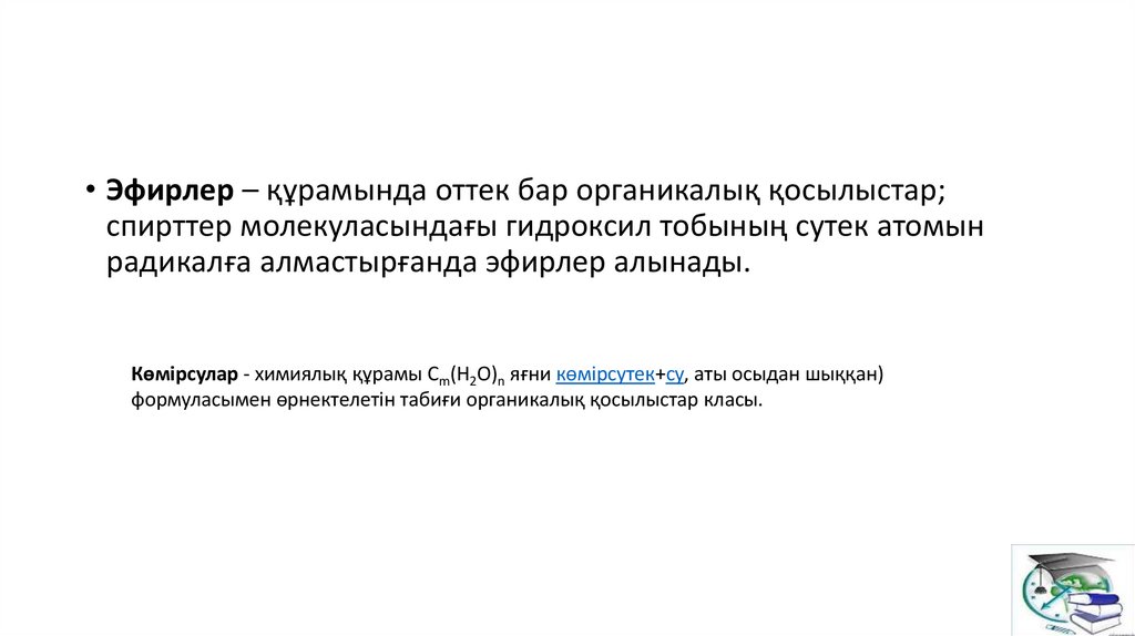 • Эфирлер – құрамында оттек бар органикалық қосылыстар;спирттер молекуласындағы гидроксил тобының сутек атомын