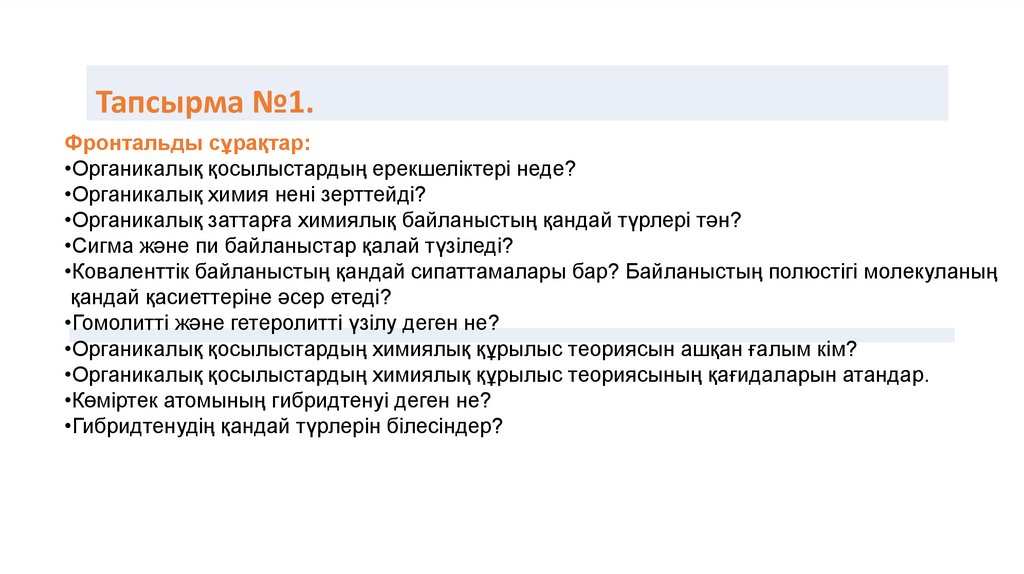 Тапсырма №1.Фронтальды сұрақтар: