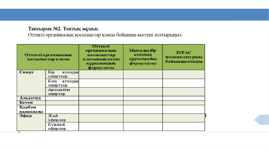 Тапсырма №2. Топтық жұмыс.Оттекті органикалық қосылыстар класы бойынша кестені толтырыңыз: