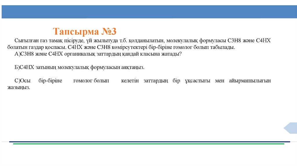 Тапсырма №3Сығылған газ тамақ пісіруде, үй жылытуда т.б. қолданылатын, молекулалық формуласы C3H8 және C4HХ