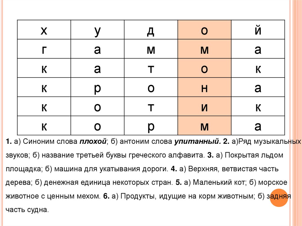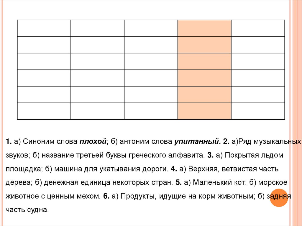 1. а) Синоним слова плохой; б) антоним слова упитанный. 2. а)Ряд музыкальныхзвуков; б) название третьей буквы греческого алфавита. 3. а) Покрытая льдом