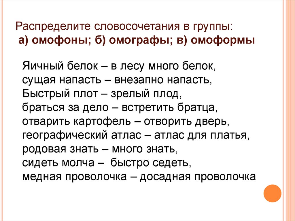 Распределите словосочетания в группы:а) омофоны; б) омографы; в) омоформы