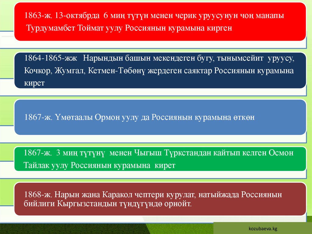 1863-ж. 13-октябрда 6 миң түтүн менен черик уруусунун чоң манапыТурдумамбет Тоймат уулу Россиянын курамына кирген