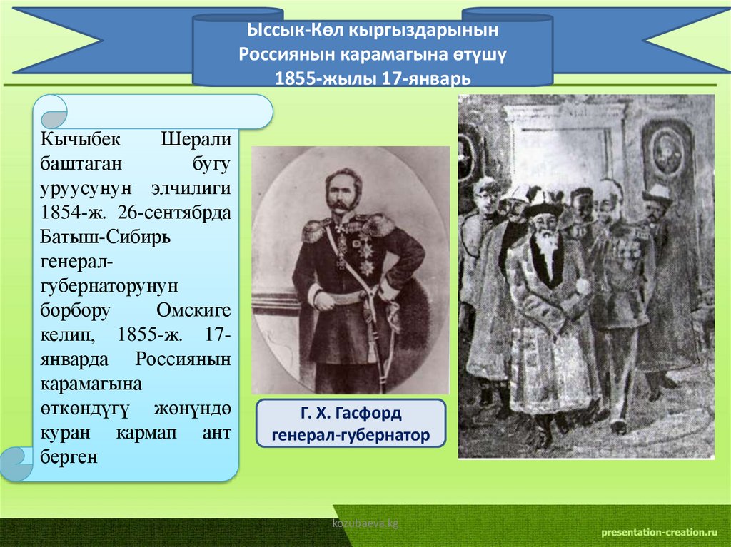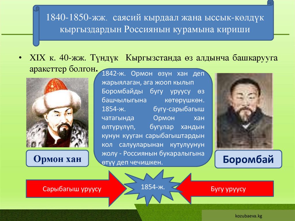 • 1840-1850-жж. саясий кырдаал жана ыссыккөлдүк кыргыздардын Россиянын курамынакириши;