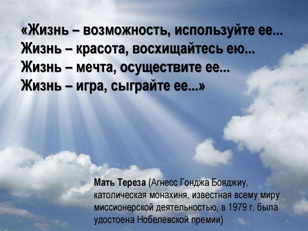 «Жизнь – возможность, используйте ее...Жизнь – красота, восхищайтесь ею...