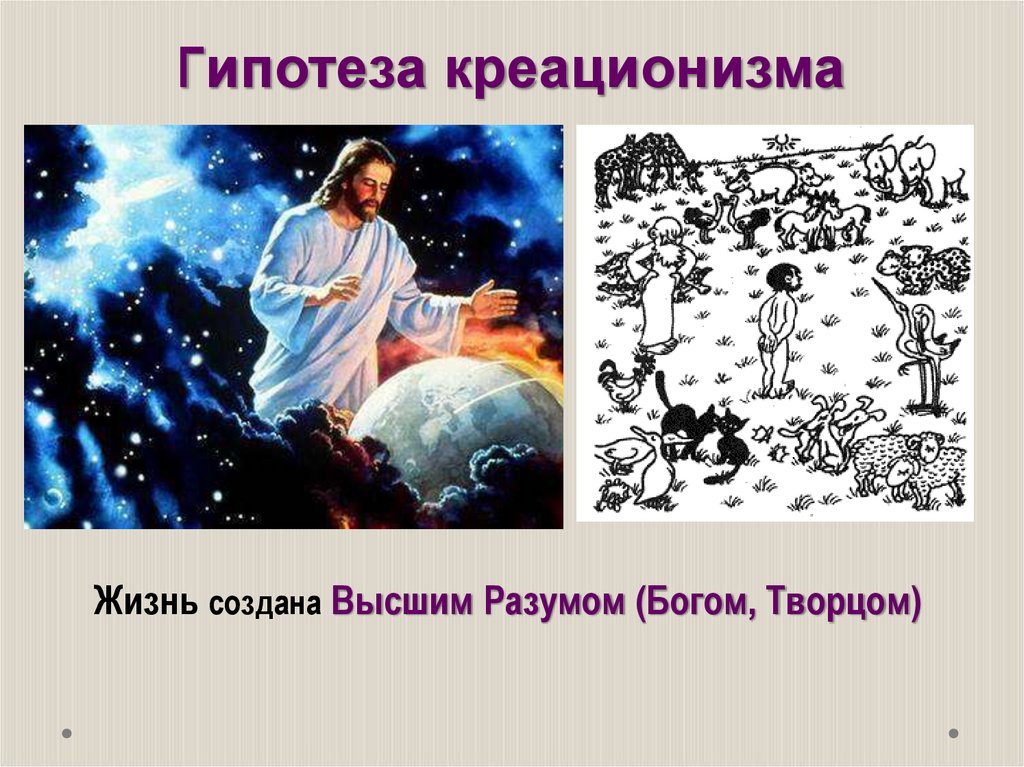 Гипотеза креационизмаЖизнь создана Высшим Разумом (Богом, Творцом)