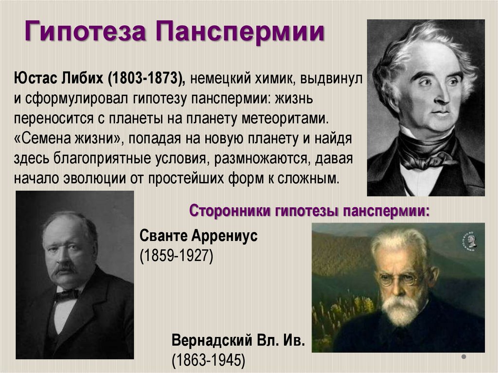 Гипотеза ПанспермииЮстас Либих (1803-1873), немецкий химик, выдвинул