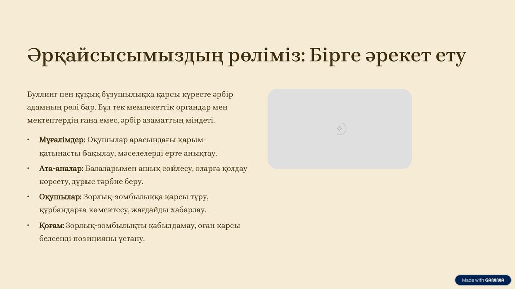 Әрқайсысымыздың рөліміз: Бірге әрекет етуБуллинг пен құқық бұзушылыққа қарсы күресте әрбір