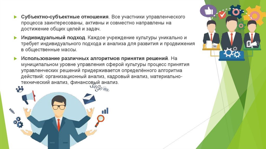 Субъектно-субъектные отношения. Все участники управленческогопроцесса заинтересованы, активны и совместно направлены на