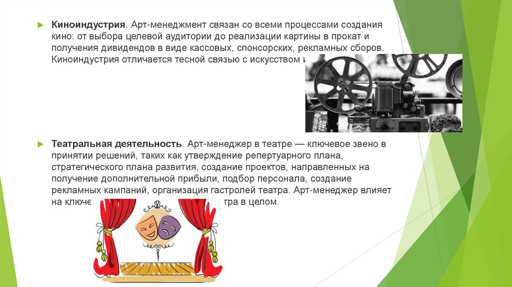 Киноиндустрия. Арт-менеджмент связан со всеми процессами созданиякино: от выбора целевой аудитории до реализации картины в прокат и