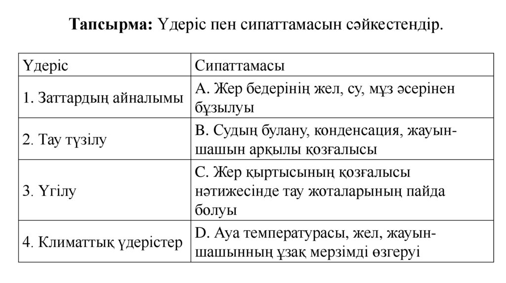 Тапсырма: Үдеріс пен сипаттамасын сәйкестендір.Үдеріс