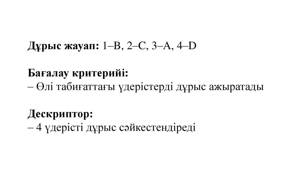 Дұрыс жауап: 1–B, 2–C, 3–A, 4–DБағалау критерийі: