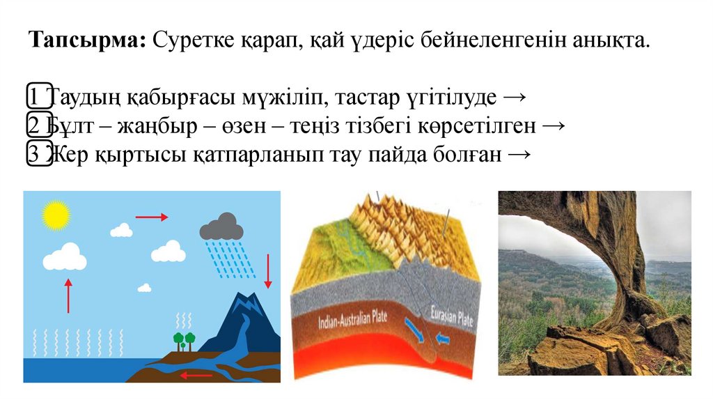 Тапсырма: Суретке қарап, қай үдеріс бейнеленгенін анықта.1 ⃣ Таудың қабырғасы мүжіліп, тастар үгітілуде →