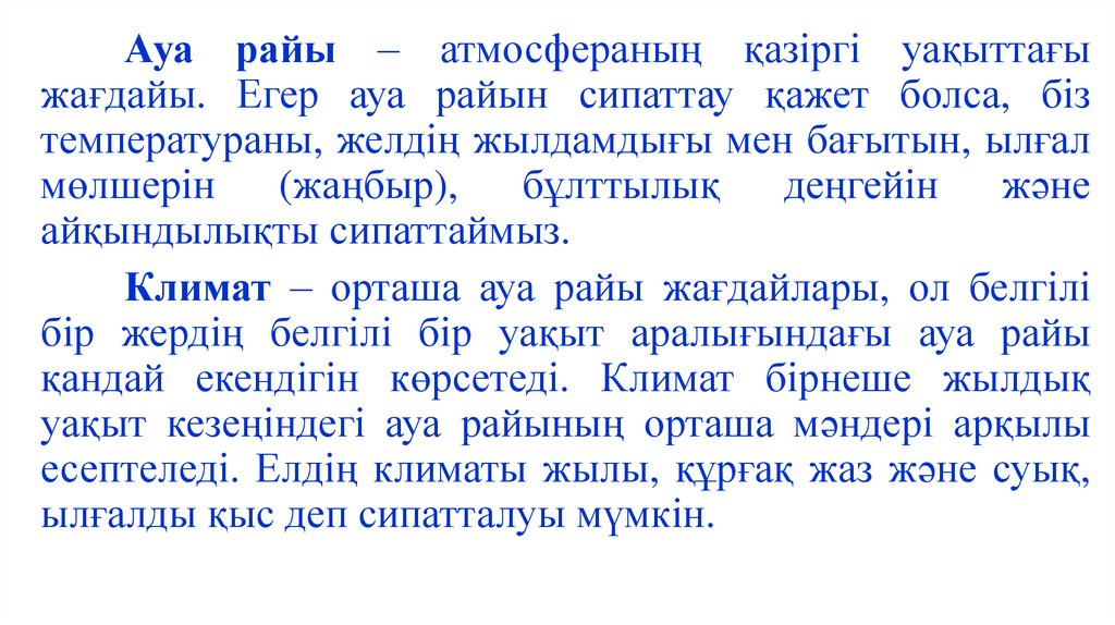 Ауа райы – атмосфераның қазіргі уақыттағыжағдайы. Егер ауа райын сипаттау қажет болса, біз