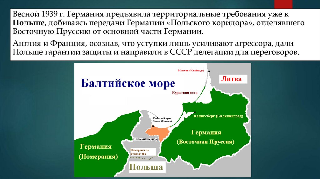 Весной 1939 г. Германия предъявила территориальные требования уже кПольше, добиваясь передачи Германии «Польского коридора», отделявшего