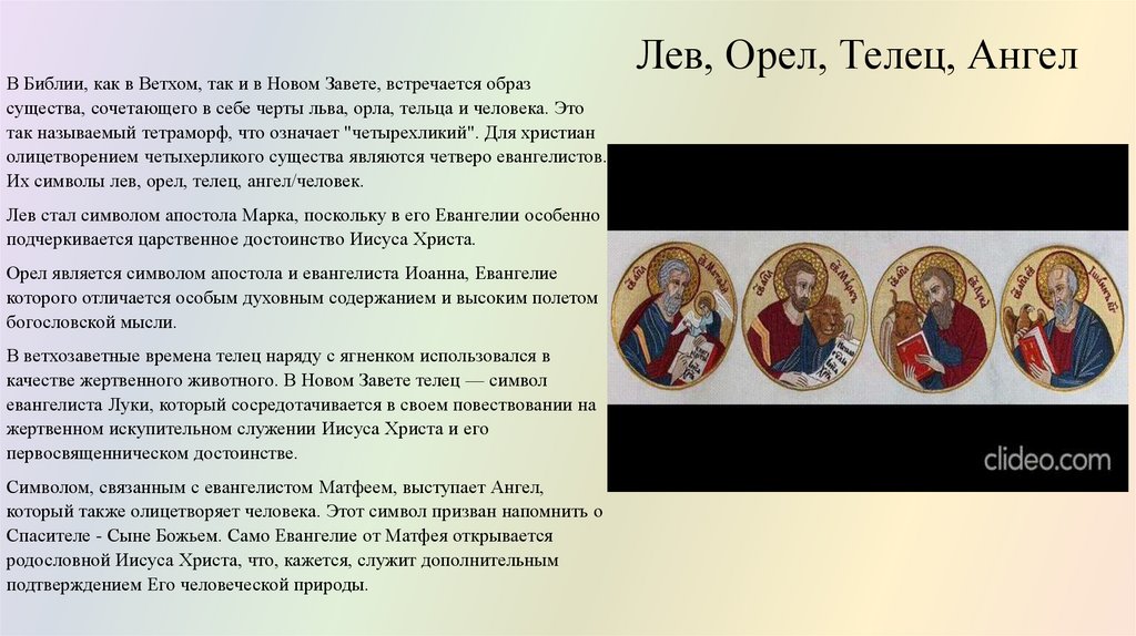 Их символы лев, орел, телец, ангел/человек.