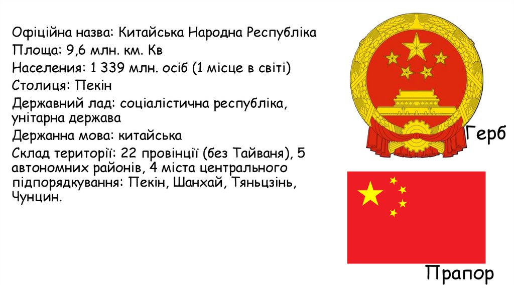 Офіційна назва: Китайська Народна РеспублікаПлоща: 9,6 млн. км. Кв