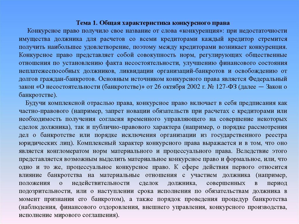 Тема 1. Общая характеристика конкурсного праваКонкурсное право получило свое название от слова «конкуренция»: при недостаточности