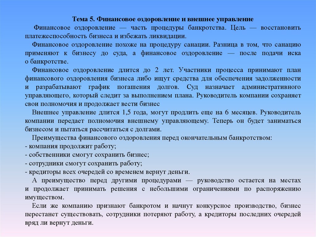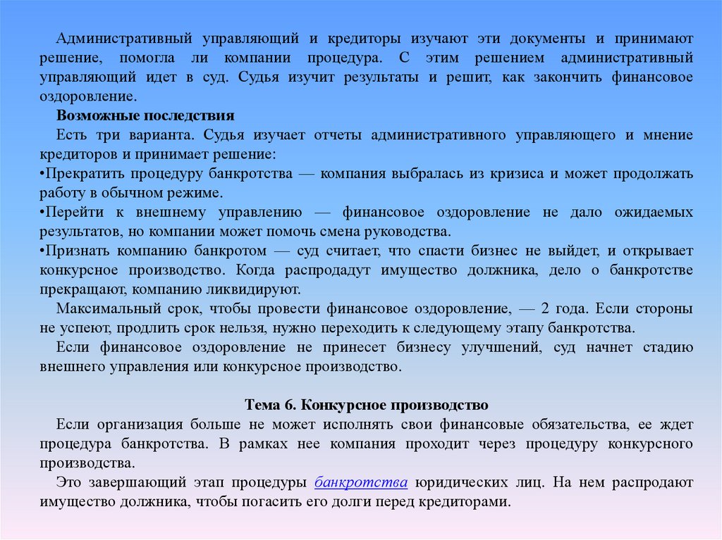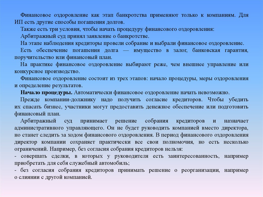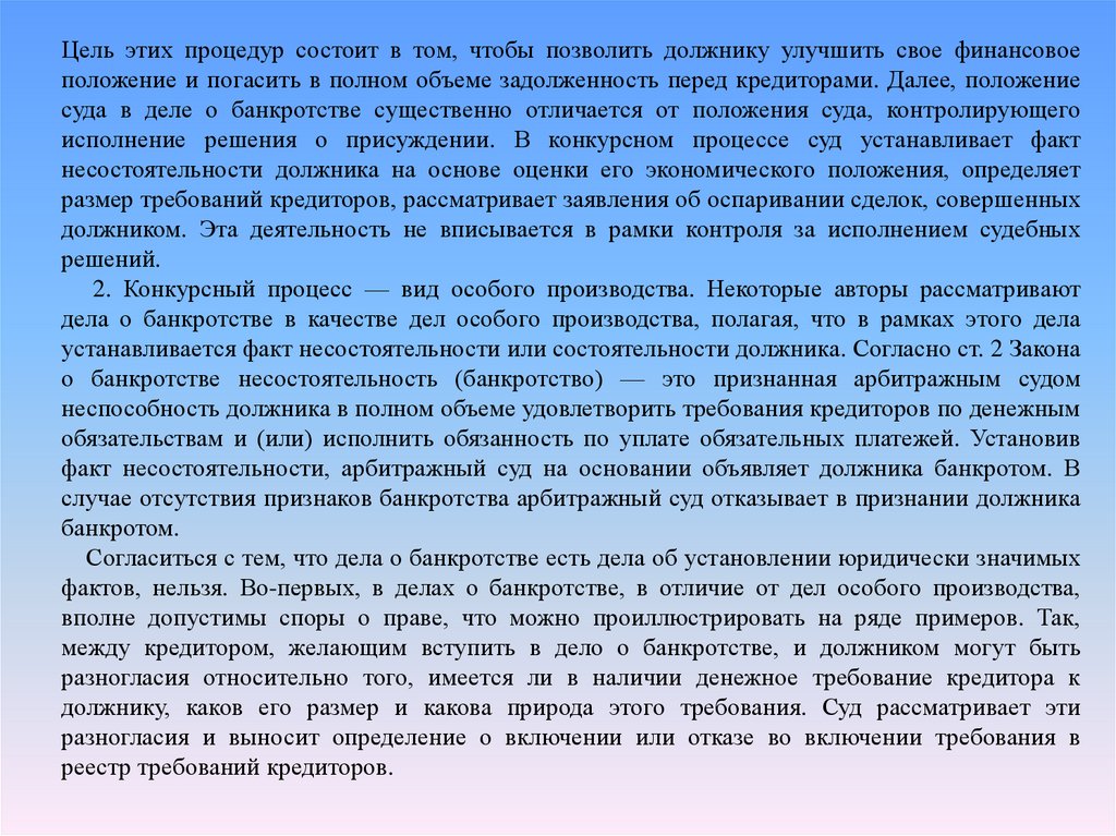 Цель этих процедур состоит в том, чтобы позволить должнику улучшить свое финансовоеположение и погасить в полном объеме задолженность перед кредиторами. Далее, положение