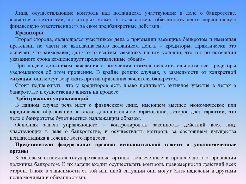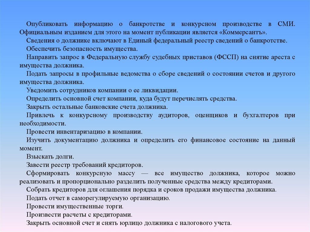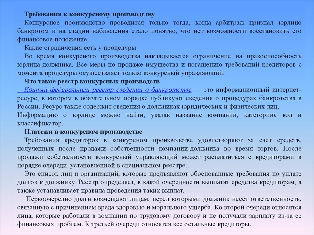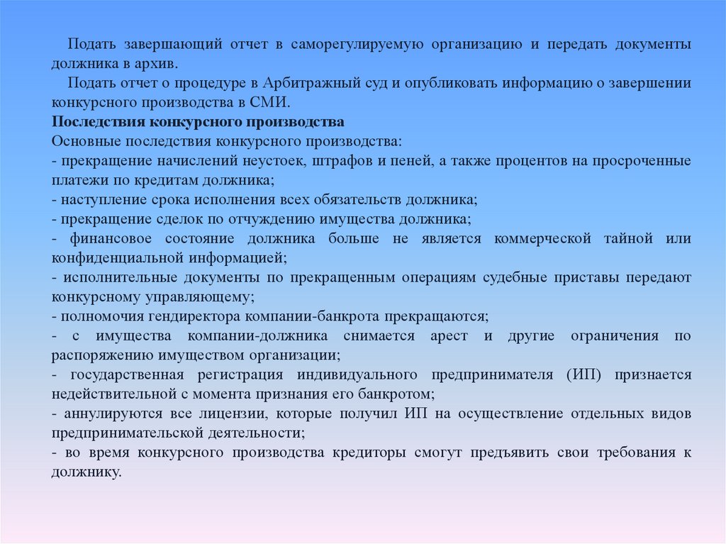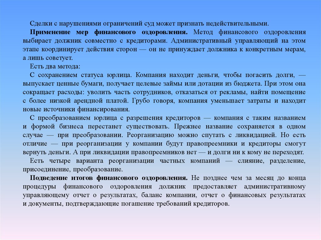 Цель этих процедур состоит в том, чтобы позволить должнику улучшить свое финансовоеположение и погасить в полном объеме задолженность перед кредиторами. Далее, положение