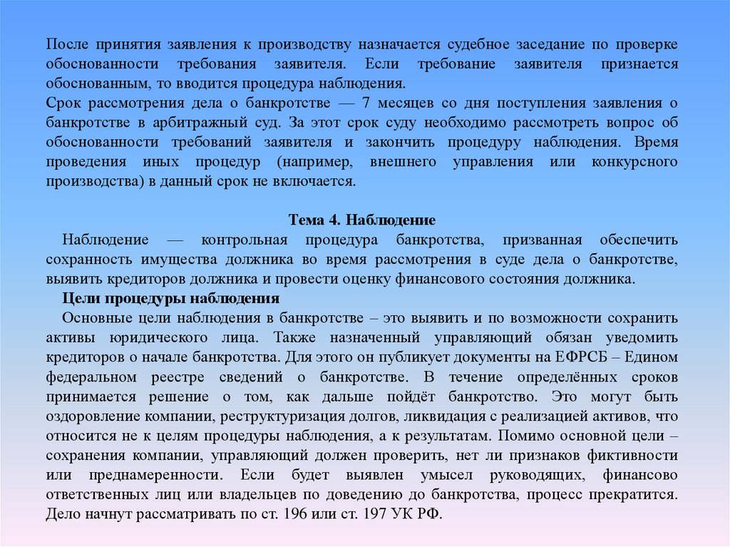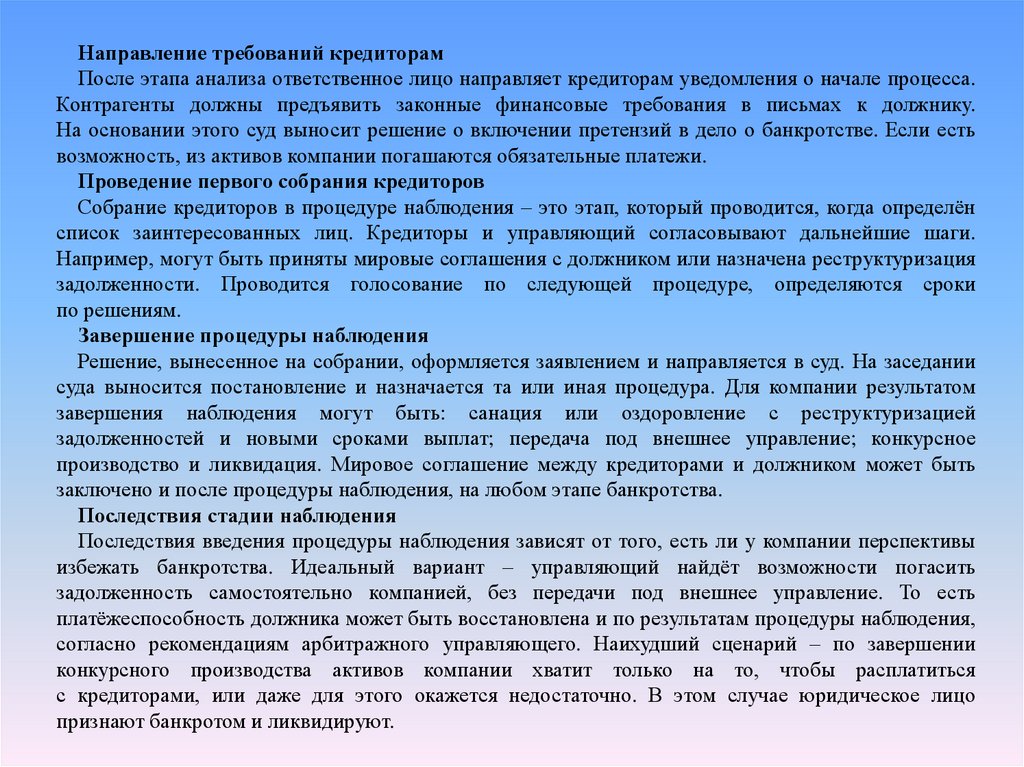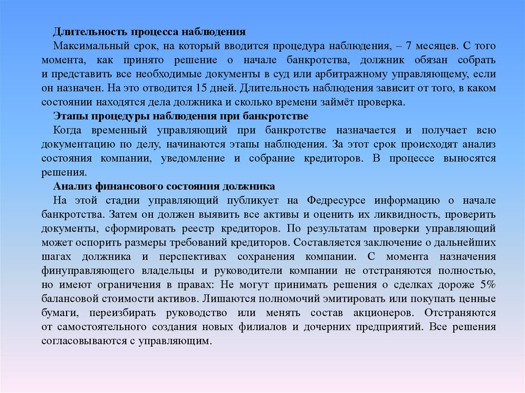 Если эти предпосылки имеются, то суд вводит процедуру наблюдения. Должник может