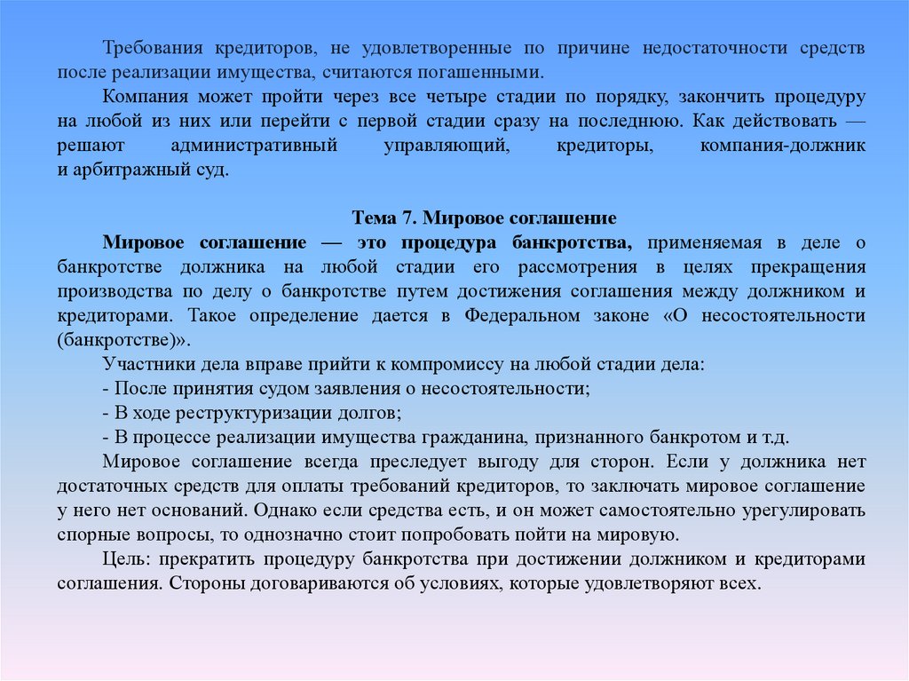 •После этого заключается мировое соглашение между банкротом и кредиторами.