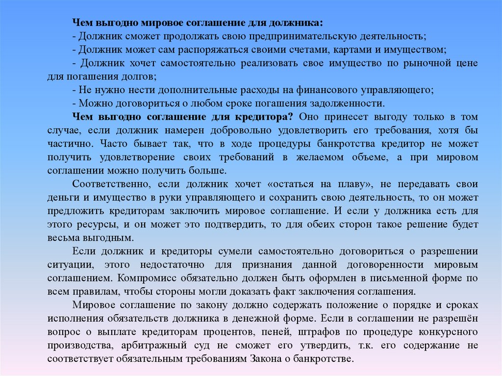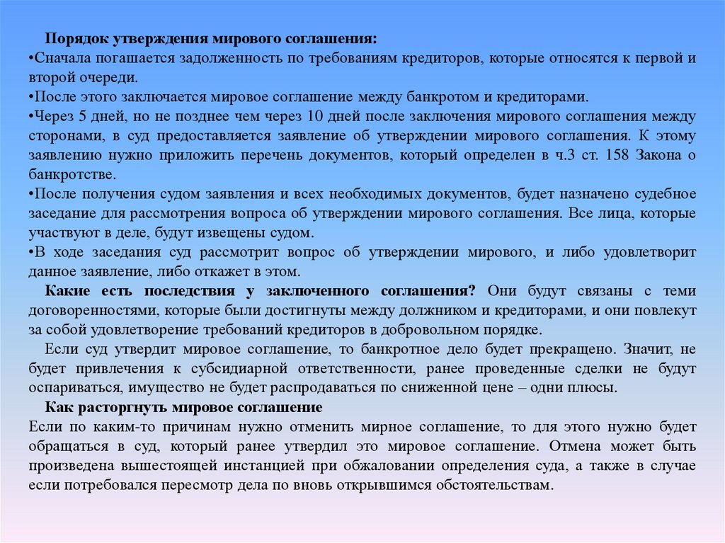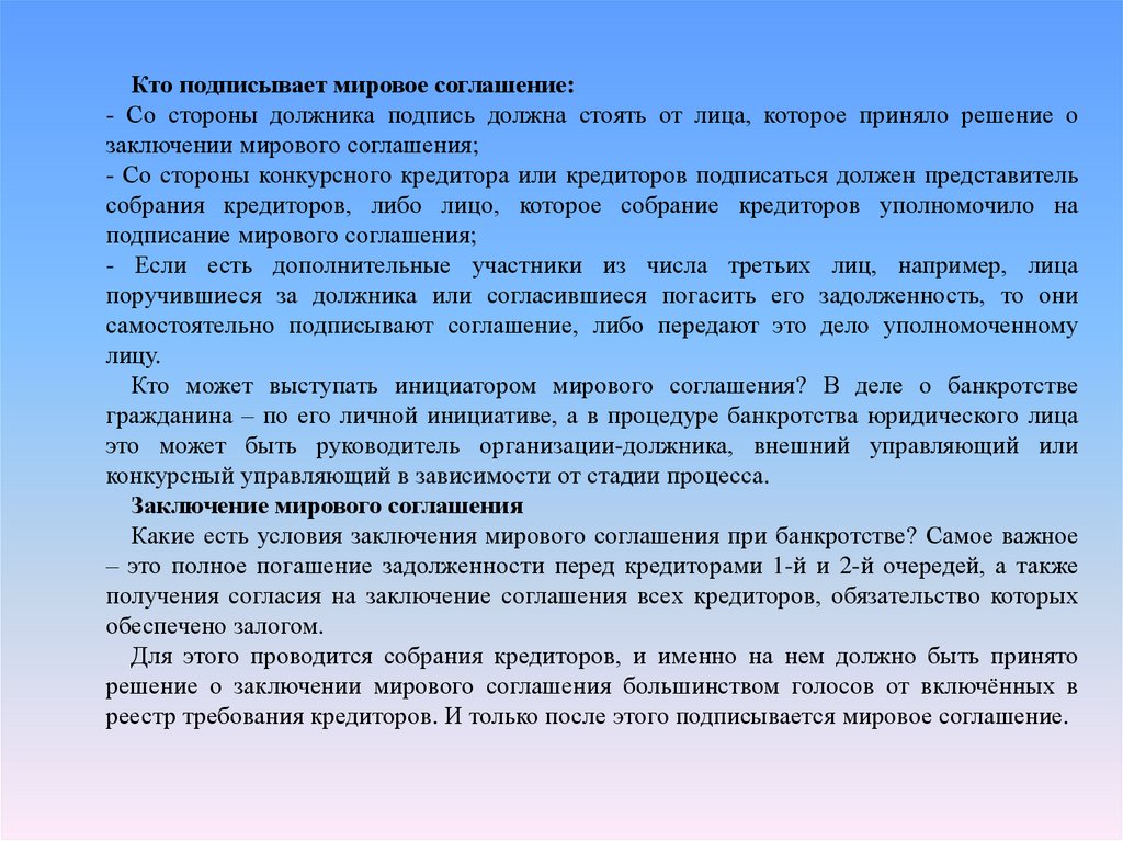 Какие есть условия заключения мирового соглашения при банкротстве? Самое важное