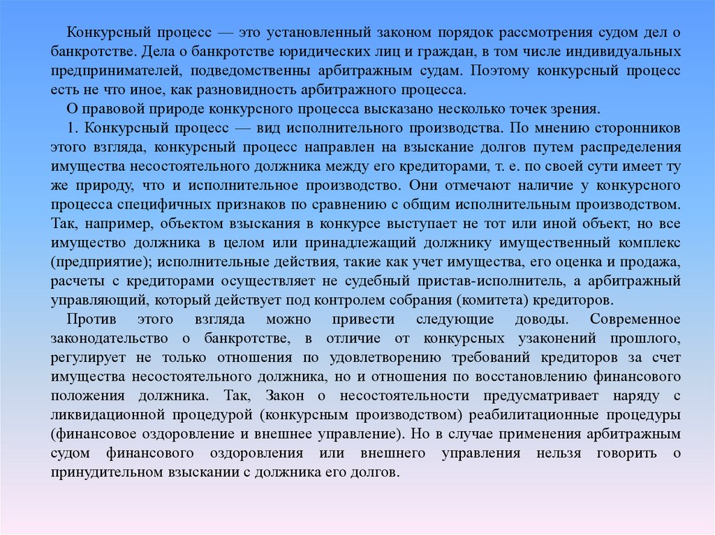 1. Конкурсный процесс — вид исполнительного производства. По мнению сторонников