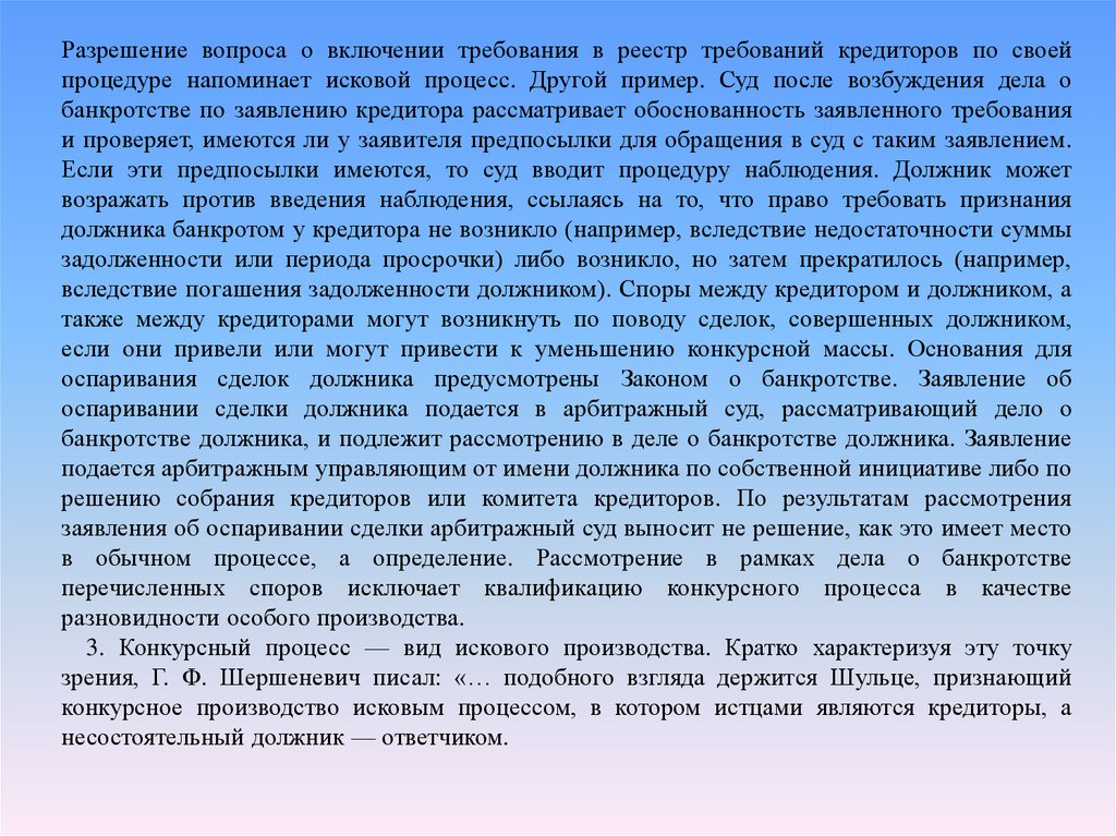 Разрешение вопроса о включении требования в реестр требований кредиторов по своейпроцедуре напоминает исковой процесс. Другой пример. Суд после возбуждения дела о