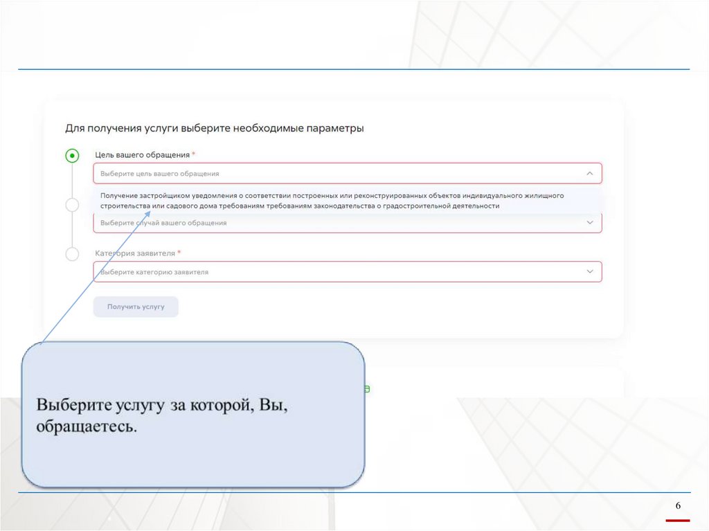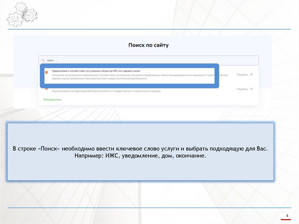 В строке «Поиск» необходимо ввести ключевое слово услуги и выбрать подходящую для Вас.Например: ИЖС, уведомление, дом, окончание.