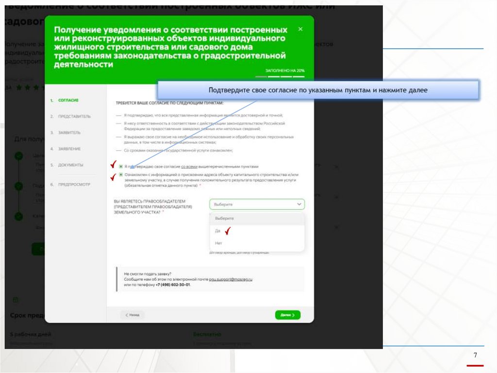10. *Заполните электронную форму заявления (сведения о земельном участке ,значение параметров построенного или реконструируемого