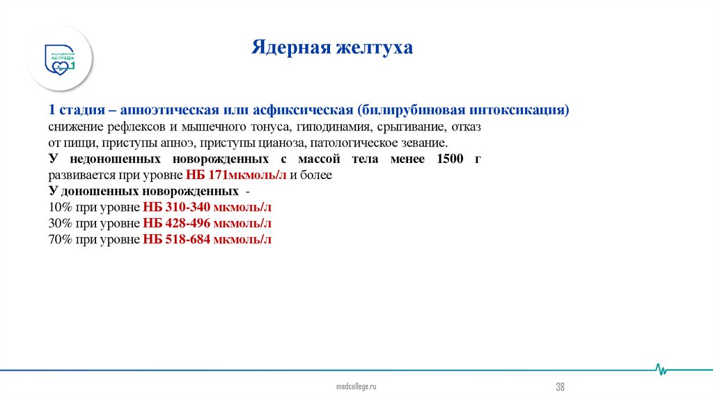 –уровень НБ: в пуповинной крови у доношенных детей составляет более 76,5 мкмоль/л, у недоношенных —59,9 мкмоль/л, на 1-е сутки — более 170 мкмоль/л, на 2-е сутки — более 256 мкмоль/л, на 3-и сутки —