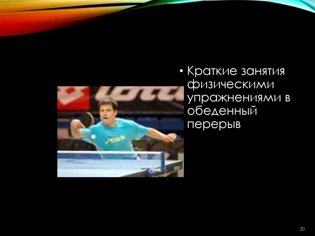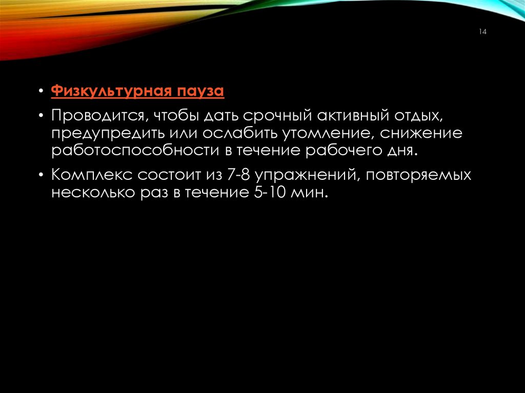 13. Краткие занятия физическими упражнениями в обеденный перерыв.