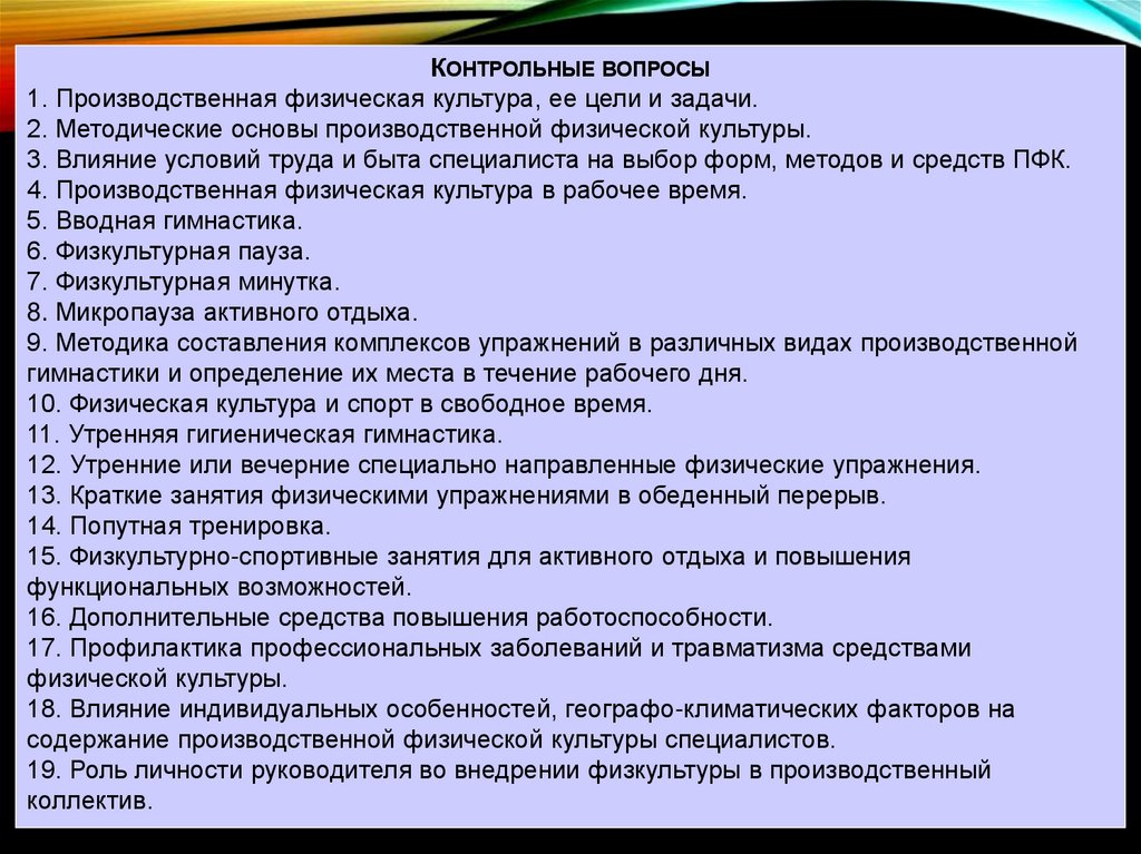 КОНТРОЛЬНЫЕ ВОПРОСЫ1. Производственная физическая культура, ее цели и задачи.