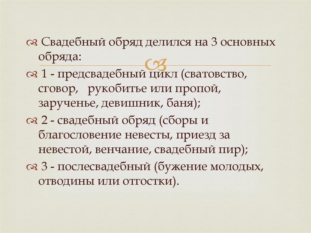 Свадебный обряд делился на 3 основныхобряда:
