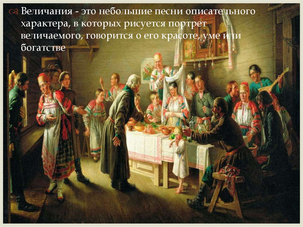 Величания - это небольшие песни описательногохарактера, в которых рисуется портрет
