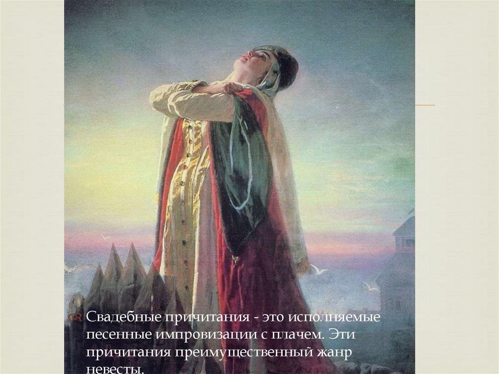 Свадебные причитания - это исполняемыепесенные импровизации с плачем. Эти